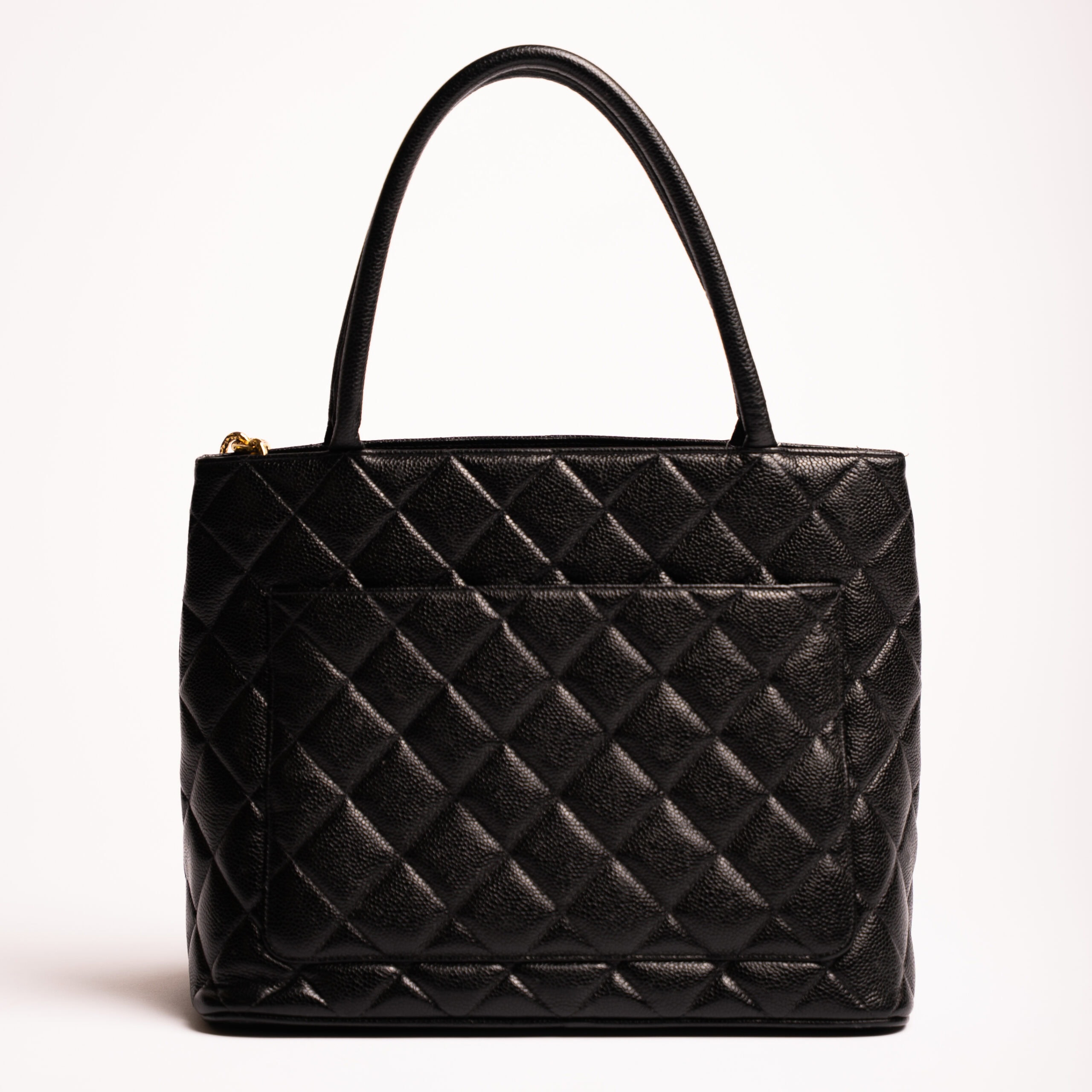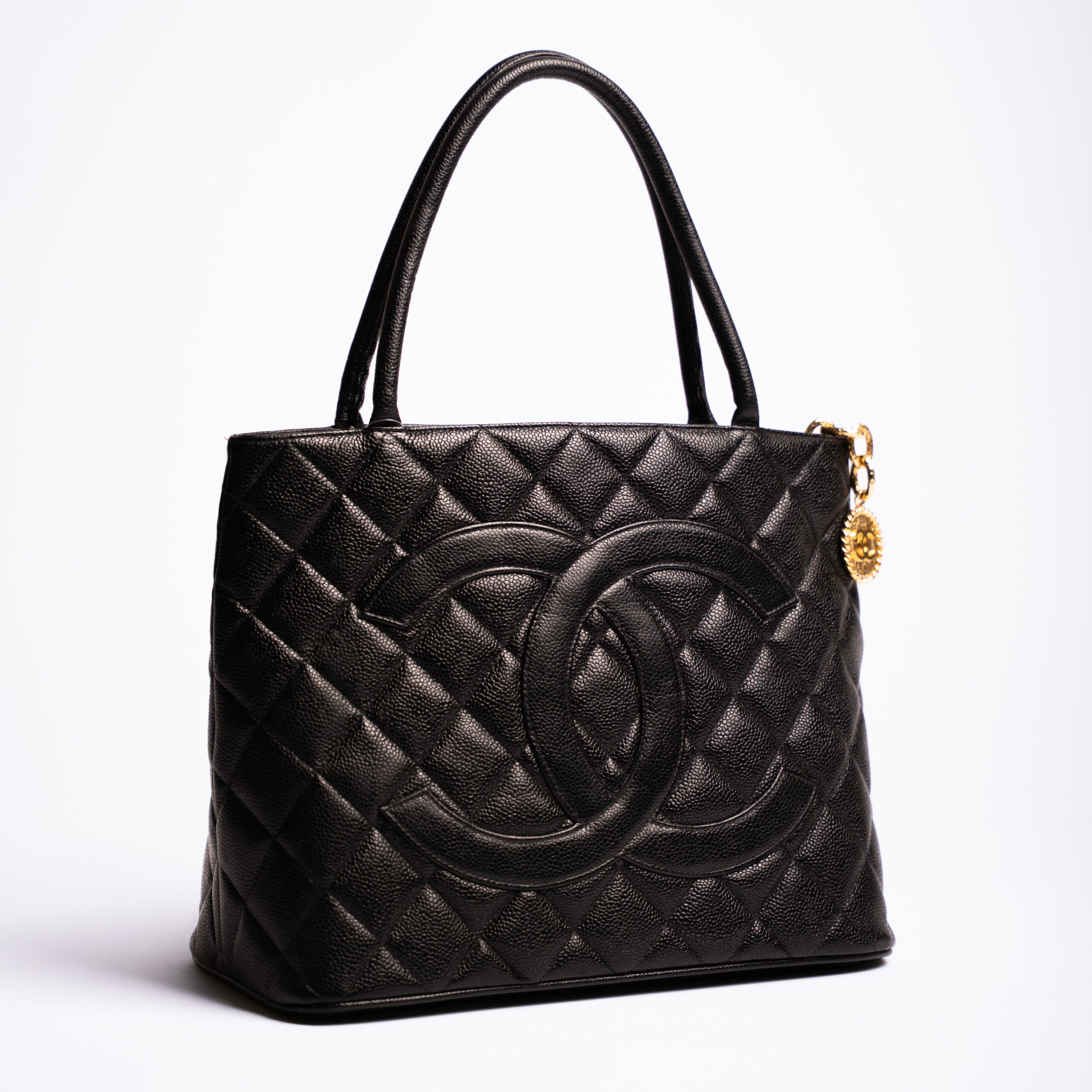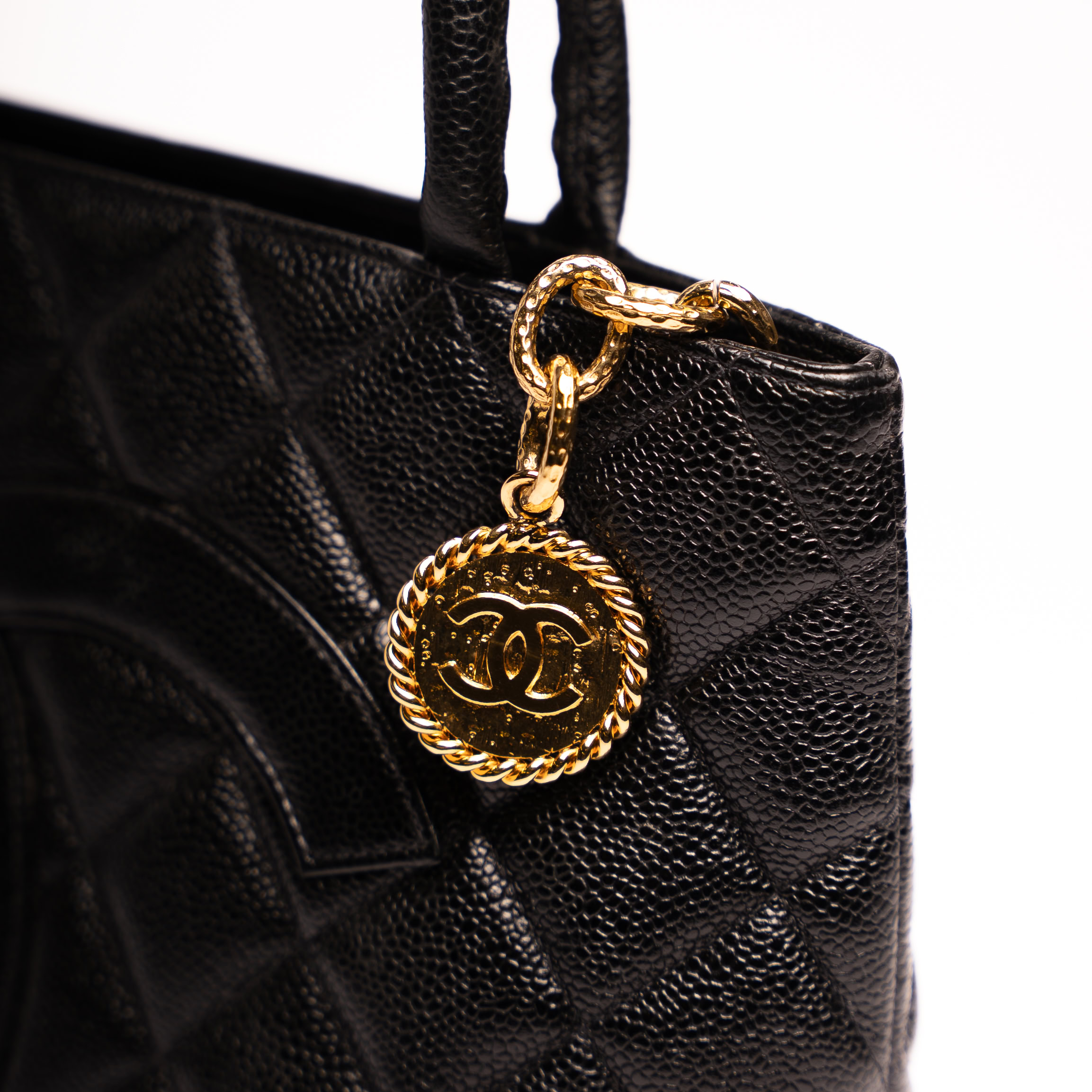 Deze Chanel Vintage Classic tote bag is een krachtig statement binnen de wereld van vintage Chanel. Het iconische doorgestikte caviar leer, het grote CC-logo op de voorzijde en het zeldzame gouden medaillon geven deze tas een uitgesproken en herkenbaar karakter. Meer dan twintig jaar oud en daarmee officieel vintage, maar nog altijd uiterst draagbaar en tijdloos in uitstraling.